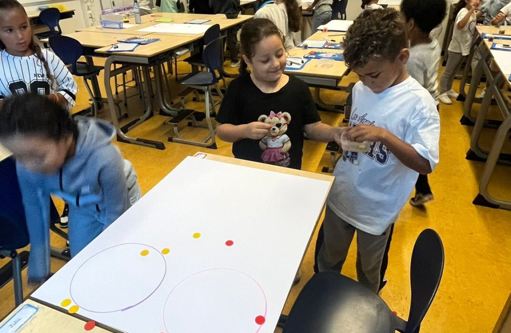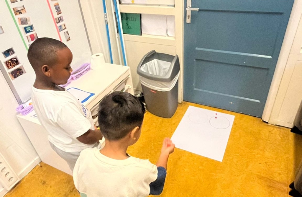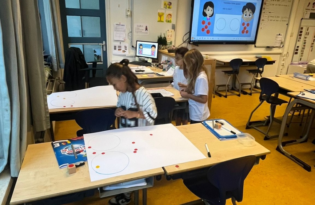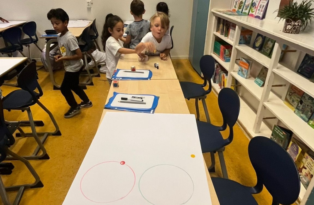 In groep 3a stond rekenen deze week letterlijk in beweging! Tijdens de les werkten de kinderen aan het plaatsen van getallen op de getallenlijn en kwamen de begrippen meer en minder regelmatig terug. Om dit te oefenen speelden ze een spel: wie de meeste fiches in de cirkel wist te gooien, had gewonnen.